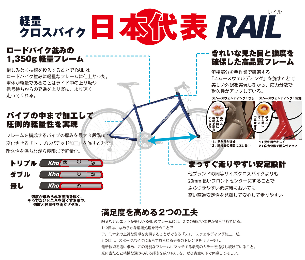 またフレーム生産時に 2 重の溶接を施し、手作業で溶接部の凹凸を研磨することで、応力集中の原因となる溶接部の急激な肉厚の変化を除去。