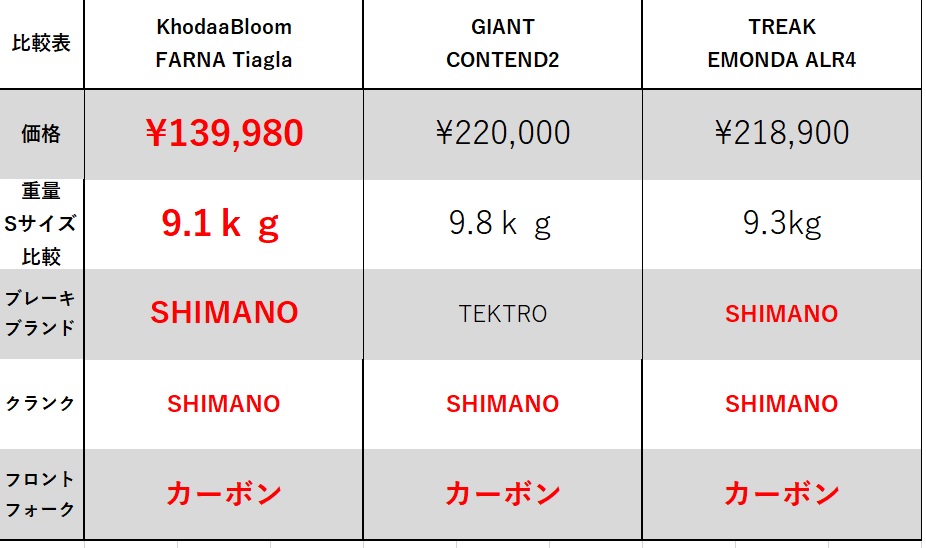 シマノTiagra装備のこの車体はクラス最高の軽さを実現